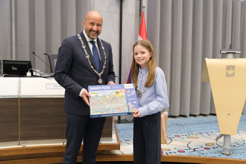 Op woensdag 28 januari nam Arnhem afscheid van Annelien van Luijt, de derde kinderburgemeester van de stad. De leerling van de Pieter Breughelschool vervulde deze rol een jaar lang en kijkt terug op een bijzondere periode. “Ik heb veel leuke en interessante dingen mogen doen, zoals bomen planten in de stromende regen, een gedicht voordragen bij de herdenking op 4 mei, het kindererf openen in het Openluchtmuseum en natuurlijk de herdenkingen rondom de Slag om Arnhem,” aldus Annelien.